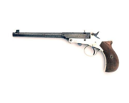 A .22 (LONG) SINGLE-SHOT TARGET PISTOL SIGNED 'COGSWELL & HARRISON', MODEL 'TRANTER'S PATENT', serial no. 2563, circa 1880, with blued two-stage sighted 8 1/2in, barrel signed 'COGSWELL & HARRISON LTD, 14 NEW BOND ST. LONDON', push-button break-barrel action, nickel plated frame and chequered birdshead grip with provision for detachable shoulder stock (missing) TOGETHER WITH a later wood case compartmented for this pistol and its shoulder stock plus ammunition, reproduction Cogswell & Harrison label to lid