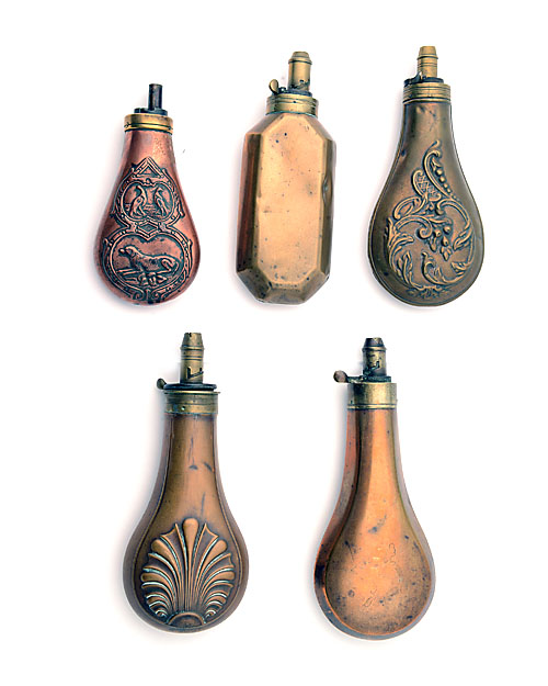 FIVE BRASS/COPPER POWDER FLASKS Please click HERE to view Terms & Conditions. Estimate £80-100