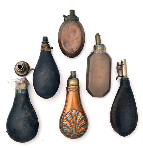 A MOROCCAN LEATHER SHOTFLASK WITH WHITE METAL TOP, together with 3 x powder flasks, shot flask