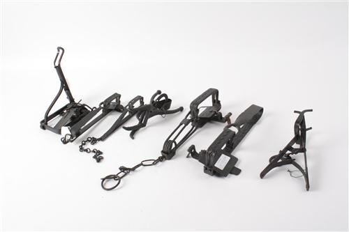 A COLLECTION OF VINTAGE MAMMAL IRON TRAPS, 4 Gin Traps of Different Sizes, 2 Vintage Mole Traps, and a Spring Trap