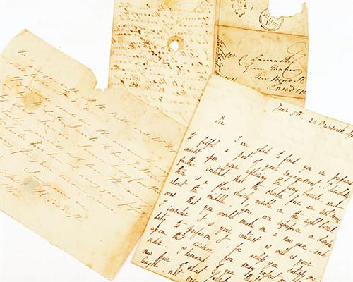 LETTERS FROM EARLY 1800S, SOME FRAGILE, PLUS OTHER HISTORICAL MEMORABILIA REFERRING TO CHARLES LANCASTER. DETAILS BELOW: a) 27 July 1829 - A hand-written letter from Matthew H Lister of South Lincolnshire to Mr C Lancaster, Gunmaker of 151 New Bond Street, London requesting that his gun be cleaned and placing orders for a cloth case for the gun as well as a leather case and also an oil skin cover for "rainy weather". As an afterthought a powder horn and shot pouch were also ordered. These items were never paid for despite various invoices being sent to Mr Lister.