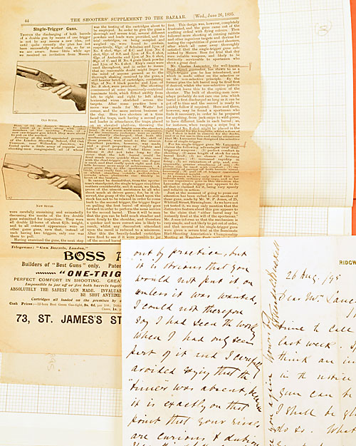 d) 26 June 1895 - The original press cutting from p44 of The Shooters' Supplement to THE BAZAAR, discussing the latest Single-Trigger guns by Boss, Charles Lancaster and W.P. Jones.