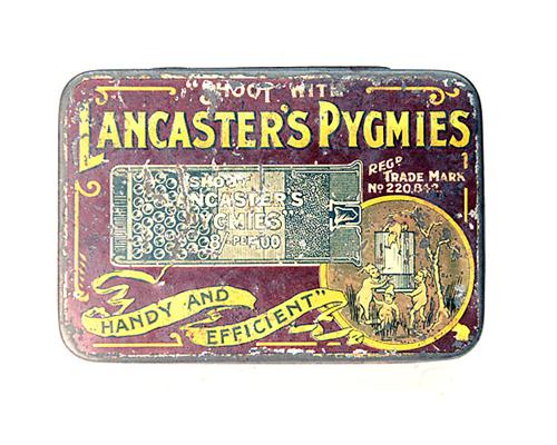 MID-1890S CHARLES LANCASTER EMPTY TIN, (3 1/2 in x 2 1/2 in) that once contained Lancaster's Pygmies. Background colour dark red with gold lettering, (See p144/5 of Don Masters' book, ATKIN, GRANT & LANG)