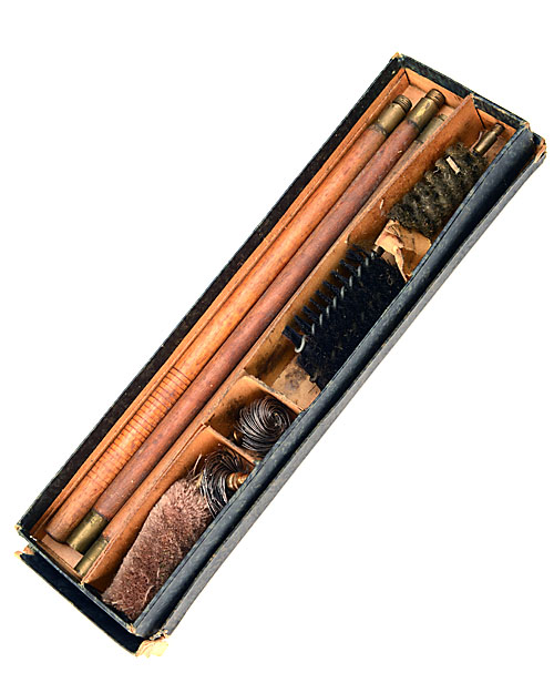 A BOXED SET OF GUN CLEANING EQUIPMENT, INCLUDING 2 SCREW WOODEN RODS, 3 BRUSHES, 2 BARREL SCOURERS AND ONE POLISHER.