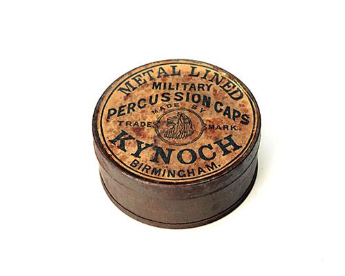 AN ANTIQUE ROUND (2 ½ IN DIA.) METAL-LINED TIN OF MILITARY PERCUSSION CAPS MADE BY KYNOCH OF BIRMINGHAM,
