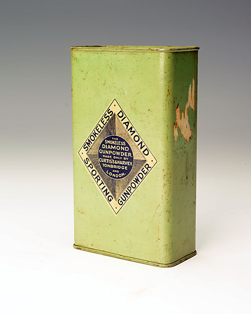 A VINTAGE/ANTIQUE TIN OF CURTISS & HARVEYS (TONBRIDGE & LONDON) SMOKELESS DIAMOND SPORTING GUNPOWDER IN RECTANGULAR GREEN TIN,