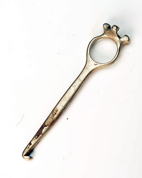 A 4 1/2 IN NICKEL-PLATED .450 CARTRIDGE EXTRACTOR TOOL BY JAMES DIXON & SONS WITH A THREE-FINGERED CLAW AT ONE END.