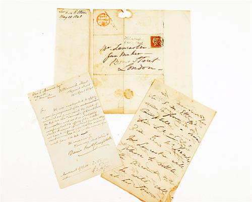 CORRESPONDENCE BEARING A RARE PENNY RED POSTAGE STAMP, FEATURING THE YOUNG QUEEN VICTORIA, April and May 1848, affixed to one of two letters sent to the gunmakers Charles Lancaster:
