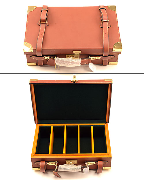 A UNUSED BRASS-CORNERED LEATHER CARTRIDGE MAGAZINE, suitable for 250 cartridges, lined with green baize, brass lock (including key), four fixed dividers