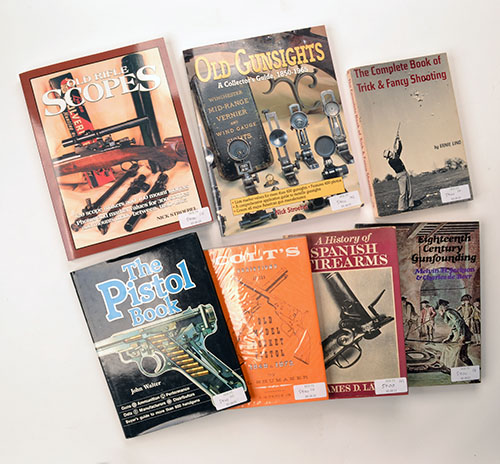 SEVEN BOOKS RELATING TO RIFLES AND SHOOTING, including 'OLD GUNSIGHTS - A COLLECTORS GUIDE 1850 - 1965' by N. Stroebel, 'OLD RIFLE SCOPES - 1890 -1985' by N. Stroebel, 'EIGHTEENTH CENTURY GUNFOUNDING' by M. Jackson, 'A HISTORY OF SPANISH FIREARMS' by J. Lavin, 'THE COMPLETE BOOK OF TRICK & FANCY SHOOTING' by E. Lind, 'THE PISTOL BOOK' by J. Walter, 'COLT'S VARIATIONS OF THE OLD POCKET PISTOL 1848 - 1872' by P. Shumaker (7)