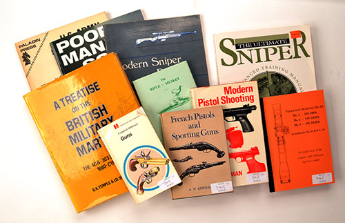 A COLLECTION OF TEN BOOKS ON SNIPERS, RIFLES AND SHOOTING, including 'A TREATISE ON THE BRITISH MILITARY MARTINI' by B. Temple, 'THE RIFLE MUSKET - 1854' by Capt. J. Jervis, 'MODERN PISTOL SHOOTING' by P. Freeman, 'GUNS' by F. Wilkinson, 'FRENCH PISTOLS AND SPORTING GUNS' by A. Kennard, 'TELESCOPIC SIGHTING NO. 32' by P. Laidler, 'U.S. ARMY SNIPER TRAINING MANUAL' by US War Office, 'POOR MAN'S SCOUT RIFLE A HOW TO GUIDE' by B. Cashner, 'MODERN SNIPER RIFLES' by D. Long, 'THE ULTIMATE SNIPER' by Maj. J. Plaster (10)