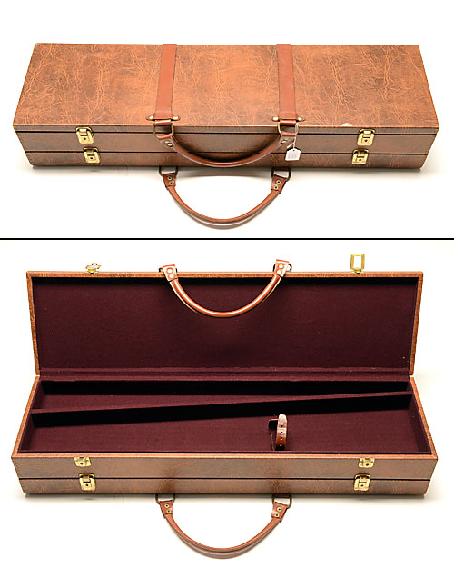 A LEATHERETTE DOUBLE GUNCASE, suitable for barrels up to 35in., two sided opening, one side lined with maroon baize, the other unboxed and no baize lining, four locks, carry handle