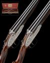 28in. nitro reproved chopperlump barrels, the ribs gold-inlaid '1' and '2' and engraved 'J. PURDEY & SONS. AUDLEY HOUSE. SOUTH AUDLEY STREET. LONDON. MADE OF SIR JOSEPH WHITWORTH'S FLUID-PRESSED STEEL', 2 1/2in. chambers, bored approx. 1/4 and 1/2 choke in both, self-opening actions with rounded bars, removable striker discs, toplevers gold-inlaid '1' and '2', automatic safeties with gold-inlaid 'SAFE' details, cocking indicators, best fine bouquet and scroll engraving, brushed bright and reblued finish, 15 1/4in. figured stocks including 3/8in. extension, weight 6lb. 4oz. (both), in their brass-cornered oak and leather case, the exterior bearing various historical shipping baggage labels from the Blue Star Line
