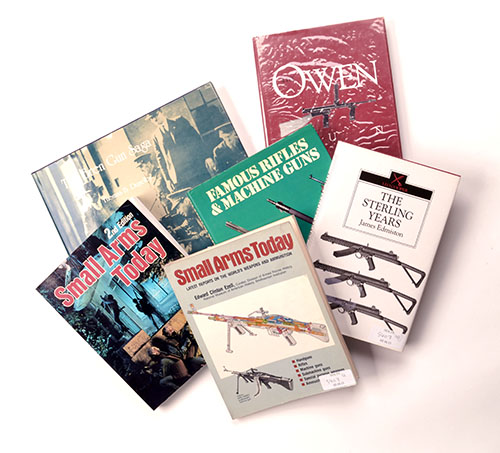 A COLLECTION OF MACHINE GUN AND SMALL ARMS RELATED BOOKS, including 'THE BREN GUN SAGA' by T. Dugelby, 'THE STERLING YEARS' by J. Edmiston, 'THE OWEN GUN' by W. Wardman, 'SMALL ARMS TODAY' by E. Ezell, 'SMALL ARMS TODAY 2nd EDITION' by E. Ezell, 'FAMOUS RIFLES AND MACHINE GUNS' by A. Cormack (6)