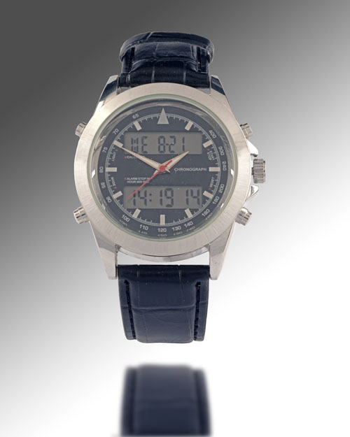 A SPIFFING GENTLEMAN'S CHRONOGRAPH WATCH with calendar, stopwatch, alarm and chime functions, analogue face with backlit digital display, in unused condition (no box)