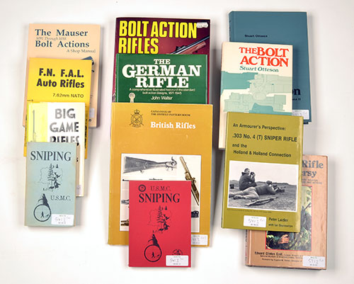 A COLLECTION OF RIFLE AND SNIPING RELATED BOOKS, including 'THE MAUSER M91 - M98 BOLT ACTIONS A SHOP MANUAL' by J. Kuhnhausen, 'THE BOLT ACTION: DESIGN ANALYSIS' by S. Otteson, 'SNIPING' by USMC, 'F.N. Auto Rifles 7.62mm NATO' by Desert Publications, 'THE GREAT RIFLE CONTROVERSY' by E. Ezell, '.303 No. 4 SNIPER RIFLE AND THE HOLLAND AND HOLLAND CONNECTION' by P. Laidler, 'THE GERMAN RIFLE' by J. Walter, 'SNIPING' by USMC, 'THE BOLT ACTION VOLUME II' by S. Otteson, 'BOLT ACTION RIFLES' by F. De Haas, 'THE CATALOGUE OF ENFIELD PATTERN ROOM BRITISH RIFLES' by HMSO, 'BIG GAME RIFLES AND CARTRIDGES' by E. Keith (12)