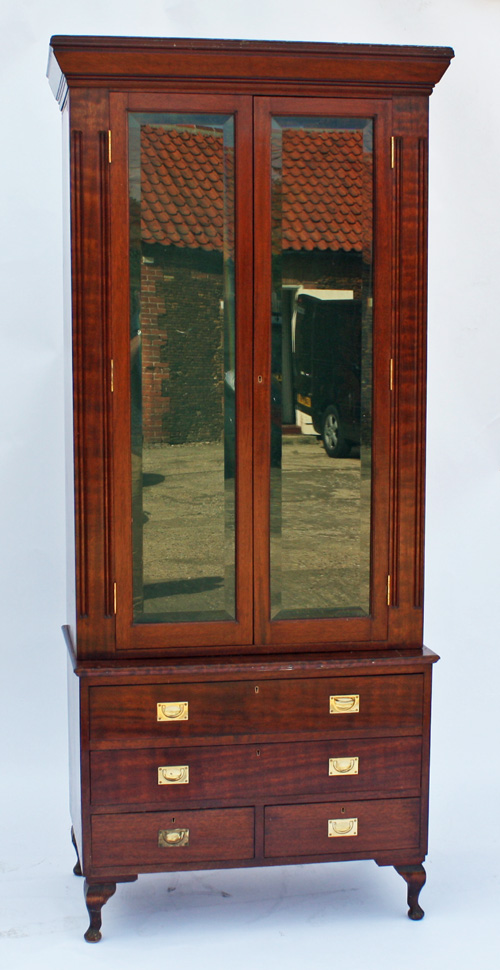 A VINTAGE MAHOGANY GUN DISPLAY CABINET, with beveled glass doors, the interior lined with green bass and fitted to hold nine guns with provisions for cleaning rods, two glass front doors, secret side door, with four drawers, measuring approx. 88in. x 39in. x 19in.