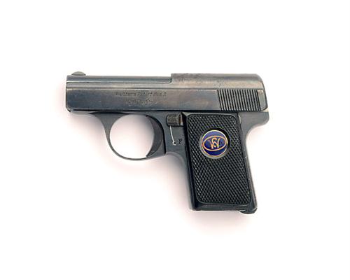 A .25 ACP (6.35mm) SEMI-AUTOMATIC VEST PISTOL SIGNED WALTHER, MODEL '9', serial no. 523529, with 2in. barrel, blued slide, blued frame, chequered hard-rubber grips and much original finish