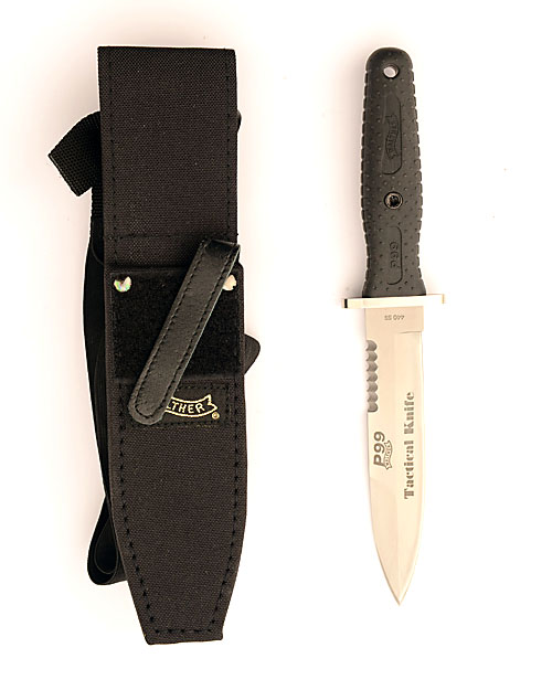 A WALTHER P99 TACTICAL KNIFE, with a 6 in. stainless steel blade, black rubber handle and Walther ballistic nylon sheath all contained in manufacturers carton (1)