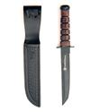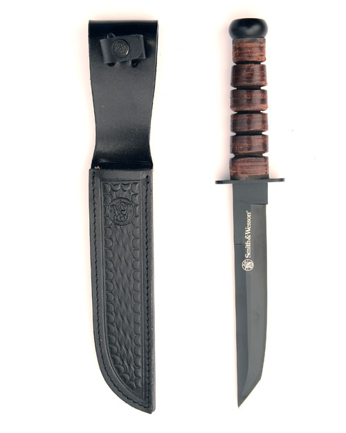 TWO SMITH & WESSON KNIVES, including a subhilt dagger knife with 8 in. stainless steel blade, buffalo horn handle and black leather sheath TOGETHER with a tanto style combat knife with 8 in. black stainless steel blade, wooden handle and black leather sheath, both in their manufacturers carton (2)