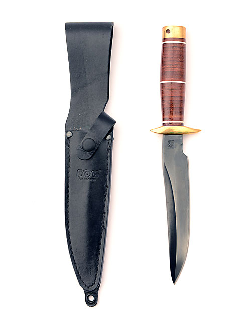 A SOG SEKI JAPAN RECON BOWIE KNIFE, with a 7 in. gun-blued polished carbon steel blade, brass guard and butt with lanyard hole, complete with black SOG branded leather sheath (1)