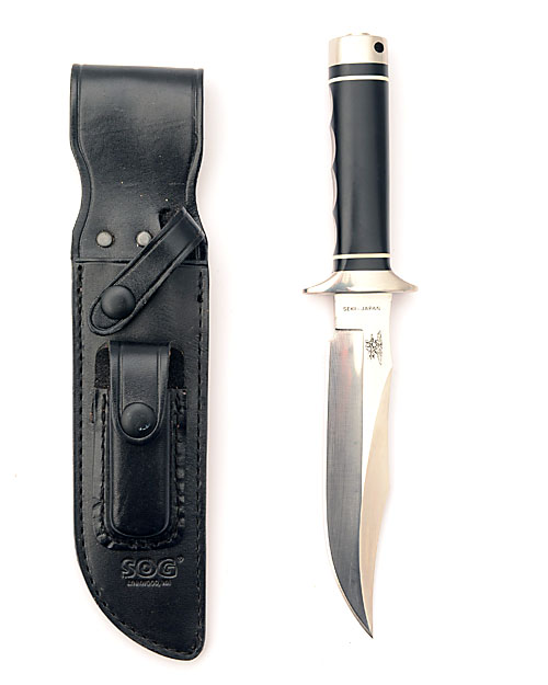 A SOG SEKI JAPAN BOWIE KNIFE, with a 5 1/2 in. stainless steel blade and hilt, black handle with lanyard hole, together with black SOG branded leather sheath and sharpening stone (1)