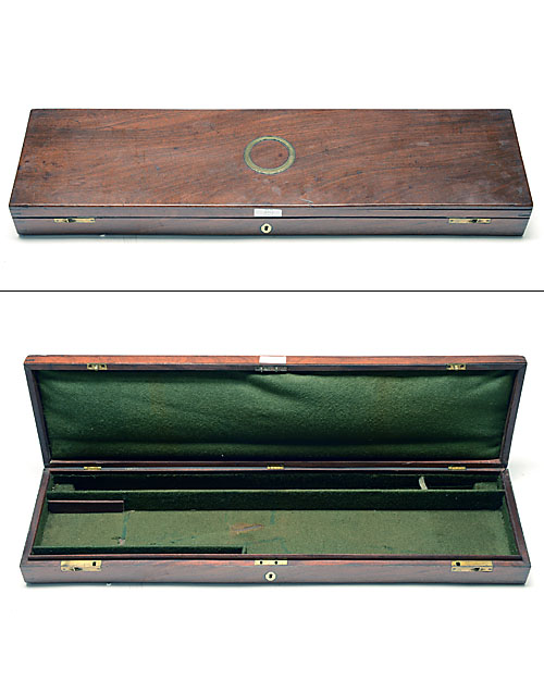 A MAHOGANY SINGLE GUNCASE, re-boxed to suit modern shotgun with barrels up to 32in., the interior lined with green baize, flush fitting brass handle