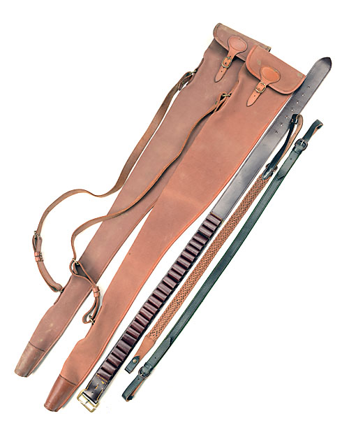 TWO CANVAS & LEATHER SINGLE GUNSLIPS, together with a leather cartridge belt, 2 x leather slings