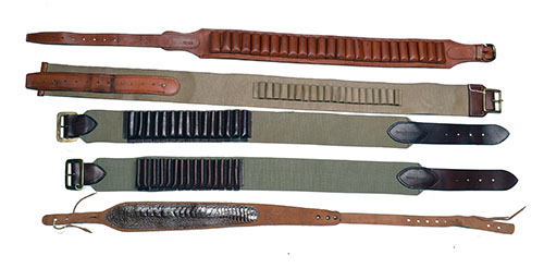 TWO 'WESTLEY RICHARDS' CANVAS & LEATHER LARGE CALIBRE RIFLE AMMUNITION BELTS, possibly for .375, .416, together with a canvas & leather rifle ammunition belt, leather 12-bore cartridge belt, suede leather & snake sking rifle sling