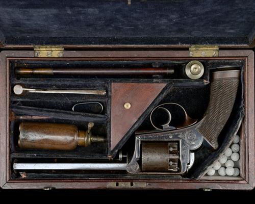 circa 1864, with blued octagonal 6 1/2in. barrel, the top-flat and strap signed 'DICKSON & SON, 63 PRINCES ST.T, EDINBURGH', engraved band to the radiused muzzle, borderline and scroll engraving to the solid frame, plain cylinder with engraved band to the front edge, spurless hammer, one-piece chequered walnut grip with engraved iron butt-cap, no provision for rammer, the whole retaining much original finish throughout, COMPLETE WITH its manufacturers brass-cornered mahogany storage case, compartmented and lined in blue velvet and containing a scissors ball-mould, a mahogany loading rod a 'JAMES DIXON' three-way revolver-flask and an oil bottle (lining dirty, one compartment lid and lock escutcheon missing)