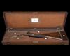 circa 1845, with browned damascus 29in. barrels, the sunken top-rib signed 'GEORGE & JOHN DEANE, (MAKERS TO H.R.H. PRINCE ALBERT) No. 30 KING WILLIAM STREET LONDON BRIDGE', bead fore-sight, border engraved colour-hardened breech blocks with platinum vents, colour hardened border and scroll engraved bar-action locks signed 'GEORGE & JOHN DEANE' featuring central engravings of hunting dogs, fully scroll engraved top-tang, figured walnut chequered straight-hand half-stock with a gold shield-shaped escutcheon to the wrist, blued iron heel-plate with scroll engraved heel-spur also featuring a hunting dog, blued scroll-engraved trigger-guard tang and finial, a further hunting dog engraved to the bow, complete with its original wood ramrod, the whole retaining much original finish and colour throughout and TOGETHER WITH a mahogany 'DEANE & SON' storage case almost certainly original to this gun, with rounded brass corners, ring handle to lid and folding brass handle to one end, the interior compartmented and lined in checkerboard embossed faux leather with further embossed borderlines and floral corners to the compartment lids, the lid interior with a raised embossed rococco scrolled crest surmounted by a Prince's crown and incorporating the Royal crests of the Royal Family and England the centre with a 'DEANE & SON' trade label above a crossed sword and sceptre, the shaped lidded interior compartments retaining an original powder flask, shot flask, nipple-key and oil-bottle.