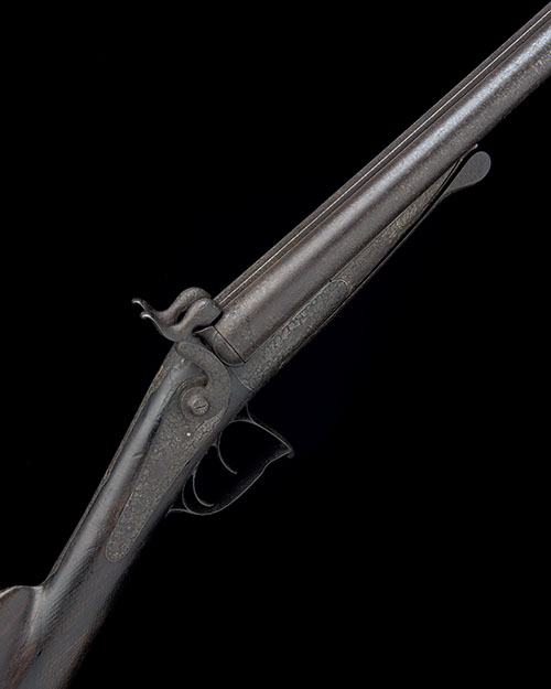 circa 1853, with twist iron laminated 29 1/2in. barrels, the top-rib relief-carved with the gothic script signature 'LEPAGE MOUTIER ARQ.R BREVETTE PARIS' terminating in a panel of carved oak and ivy-leaves, the underside of barrels signed on the flats 'LEOPOLD BERNARD, CANONNIER A PARIS', percussion fences, en-suite leaf carved decoration to the top-tang, isolated back-action locks signed around the hammers 'LEPAGE MOUTIER' with further en-suite carved leaf decoration with central silhouettes of running stags, highly figured chequered walnut butt-stock (chequering worn), engraved flat-fronted trigger-guard bow, rounded action body engraved en-suite, removable iron fore-end, the whole darkly stained with some mild pitting