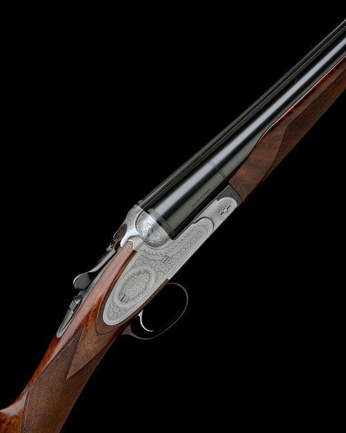 28in. nitro barrels, 3in. chambers, bored approx. 1/4 and 3/4 choke, toplever inlaid with a pigeon in flight, manual safety with integral barrel selector switch, bouquet and scroll engraving, matt silver finish, 14in. figured stock, weight 6lb. 5oz.
