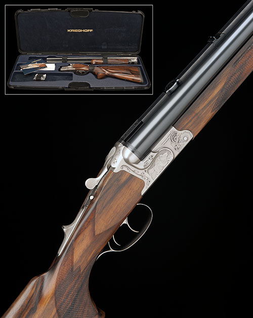 23 5/8in. (60cm.) nitro barrels with matt rib, blade fore-sight, rear flip-up open sights, 3in. shot chambers, bored approx. 1/2 and 3/4 choke, bolstered scoop-back action, hold-open toplever, manual barrel selector toggle, manual sprung cocking switch, set front trigger, partial acanthus scroll engraving surrounding carved vignettes of barking stag and running boar, satin finish, 14 1/2in. figured hogsback pistolgrip stock with sculpted cheekpiece, sling eyes, including 1/2in. rubber recoil pad, weigh 8lb. 6oz., in its makers universal case