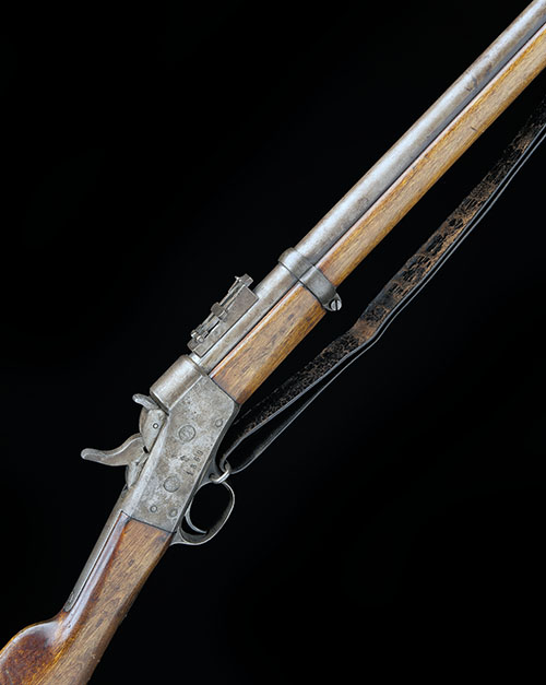 dated for 1869 and a licenced copy of the similar product by Remington, with 33in. barrel, block and blade fore-sight, elevating ladder rear-sight, plain receiver with rolling breech-block and central hammer, walnut straight-hand butt-stock and three-quarter fore-end with three iron barrel-bands, iron clearing rod and stud to right-hand side of muzzle for a socket bayonet (not included) complete with an original leather sling