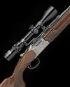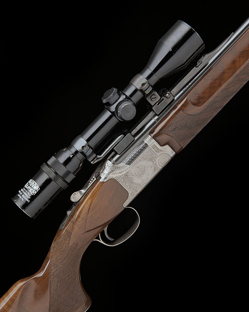 23 1/2in. nitro reproved barrels (in 2013) with matt sight rib, folding adjustable open sights, ramp-mounted bead foresight, the breech end mounted with a Shinwa Super 1.5-5x40 telescopic sight in quickly-detachable mounts, hold-open toplever, automatic safety, scroll engraved action with wild boar, stag and mouflon, silver finish overall, 13 1/2in. figured pistolgrip stock with cheekpiece and monte carlo comb, sling-eyes, steel pistolgrip-cap and including 1in. ventilated rubber recoil pad, weight 9lb. 5oz.