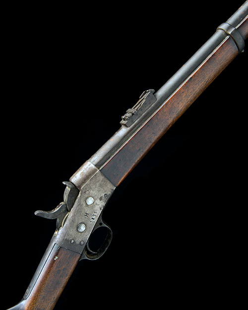 dated for 1871 and a licenced copy of the similar product by Remington, with 37 1/4in. barrel, block and blade fore-sight, elevating ladder rear-sight, plain receiver with rolling breech-block and central hammer, walnut straight-hand butt-stock stamped '25RB' over 'No468' at heel (small chip at head), iron heel-plate, walnut three-quarter fore-end with three iron barrel-bands, iron clearing rod and bayonet bar and lug to right-hand side of muzzle