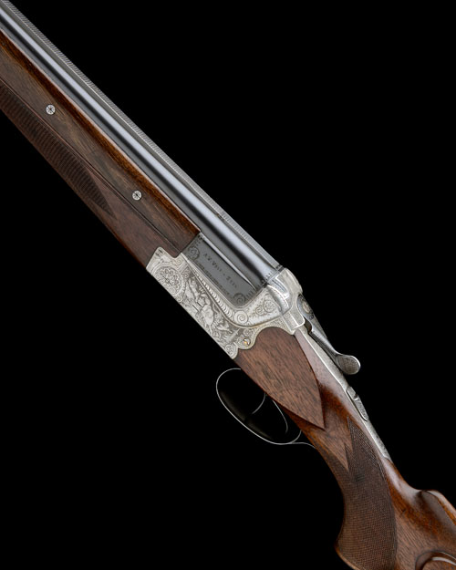 28in. nitro reproved Bohler steel barrels (in 2014) with 9mm solid raised matt top-rib, three-piece fore-end, scroll-back action with side-bolsters, hold-open toplever, manual safety, gold stud cocking-indicators, articulated front trigger, action with border and germanic scroll engraving, with game scenes of fox, rabbit and fowl, capercaillie and wildfowl, bright finish overall, 14 1/4in. pistolgrip stock with cheekpiece, sling swivels, pistolgrip-cap and buttplate, weight 6lb. 14oz.
