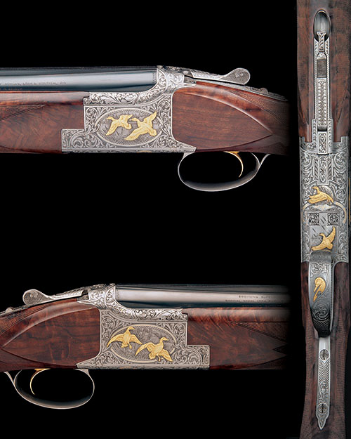 28in. nitro barrels with 8mm ventilated matt top-rib, 2 3/4in. chambers, bored approx. 1/4 and full choke, hold-open toplever, manual safety with integral barrel selector switch, gold-washed single trigger, the action and furniture carved in relief with acanthus scrollwork on a matt background interspersed with gold-highlighted vignettes of of black duck alighting on the left, the right with gold-accented fowl flushed from their naturalistic habitat, the underside with a brace of duck in flight and inlaid 'BLACK DUCK 312 OF 500 ANAS RUBRIPES', all in gold, the triggerguard with a further gold-highlighted portrait of a black duck, the action signed 'JEAN H. DIET.', 14in. highly figured semi-pistolgrip stock, the chequering with ornate aliform borders, weight 7lb. 9oz., in a carton