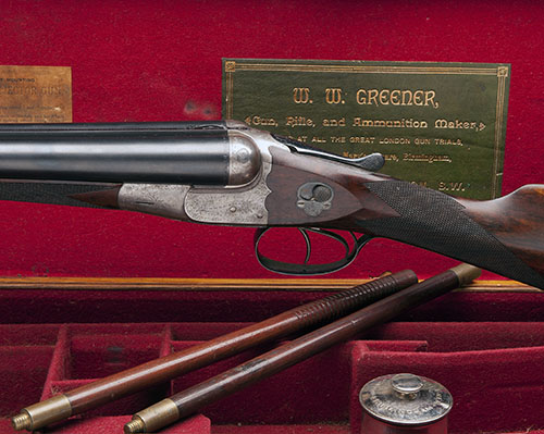 27in. nitro reproved Greener trade mark steel barrels, raised matt rib engraved 'W. W. GREENER. 68. HAYMARKET LONDON & ST. MARY'S SQUARE. BIRMINGHAM. DEPOT UNIQUE. 8 AVENUE DE L'OPERA. PARIS. WINNER AT THE LONDON GUN TRIALS. 1875.1877. 1878 & 1879', 2 1/2in. chambers, bored approx. 1/4 and full choke, treble-grip scroll-back action with side shoulders, manual safety with gold-inlaid 'SAFE' detail, border and scroll engraving, 14in. well-figured stock, fore-end with Deeley & Edge patent release and horn finial, weight 6lb. 5oz., in its brass-cornered oak lined case with gold tooled label and large Greener oil pot