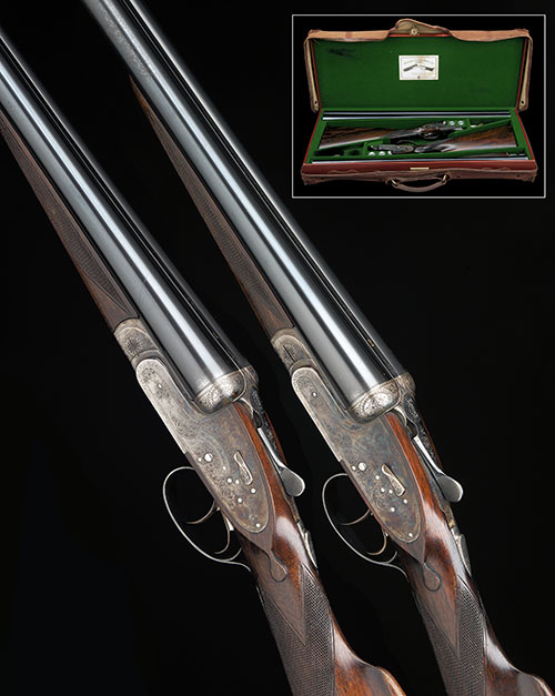 28in. nitro chopperlump barrels, the ribs engraved 'HOGAN & COLBOURNE. GUNMAKERS. STRATFORD-ON-AVON. ENGLAND.' and gold-inlaid '1' and '2' at the breech ends, 2 3/4in. chambers, bored approx. 1/4 and 3/4 (No.1) 3/4 and full choke (No.2), toplevers gold-inlaid '1' and '2', automatic safeties with gold-inlaid 'SAFE' details, hand detachable lockplates, articulated front triggers, rolled-edge triggerguards, border and partial acanthus scroll engraving, retaining some original colour-hardening and finish, the triggerplate signed 'J.G. SALT. SCULP'. 1985', 15in. figured stocks, weight 6lb. 8oz. (No.1) 6lb. 7oz. (No.2), in their brass-cornered leather case with canvas outer