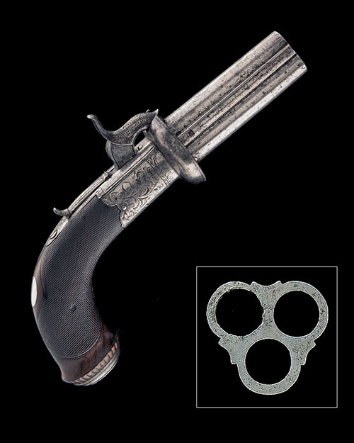 AN 80-BORE PERCUSSION THREE-SHOT HAND-ROTATED PEPPER-BOX PISTOL, no visible serial number,