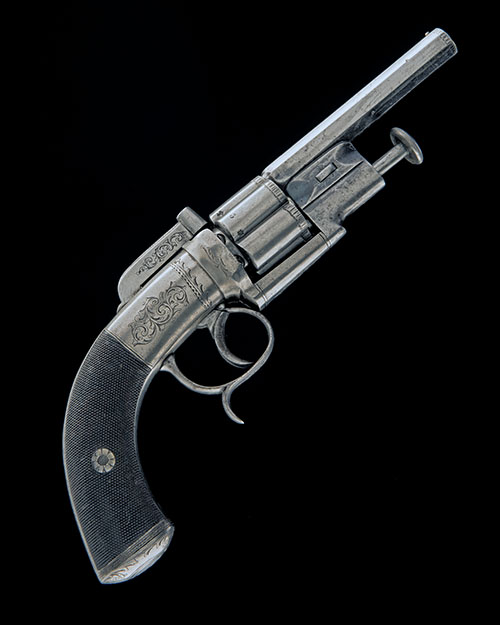 A SCARCE 80-BORE PERCUSSION DOUBLE-ACTION SIX-SHOT TRANSITIONAL REVOLVER, no visible serial number,