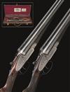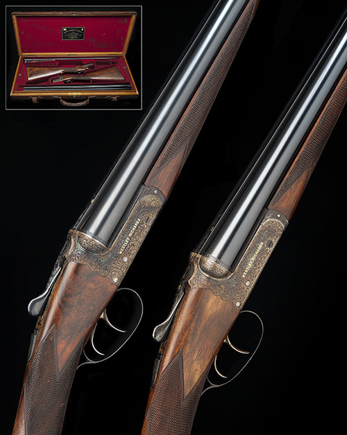 28in. nitro barrels, ribs engraved 'WESTLEY RICHARDS & CO. LONDON', and gold-inlaid '1' and '2', 2 3/4in. chambers, bored approx. 1/4 and 3/4 choke, scroll-back actions, toplevers gold-inlaid '1' and 2, automatic safeties with gold-inlaid 'SAFE' details, actions deeply carved with bold acanthus scrollwork and gold-inlaid with the makers name, retaining virtually full colour-hardening and finish, 15 1/8in. figured stocks, weight 5lb. 12oz. and 5lb. 15oz., in a J. Purdey & sons brass-cornered oak and leather case