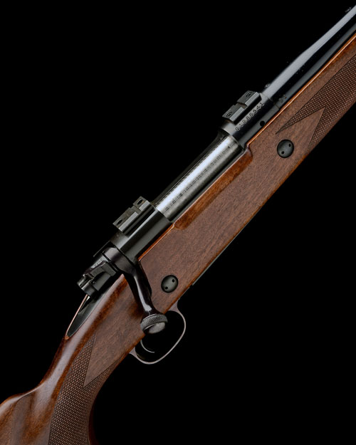 24in. nitro barrel with ramp-mounted bead fore-sight, receiver fitted with scope rails, hinged floorplate marked 'SUPER EXPRESS', blued finish, pistolgrip stock with cheekpiece, pistolgrip-cap carved in relief with a boar, sling swivels,13 3/8in. pull including 7/8in. rubber recoil pad
