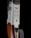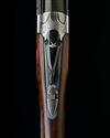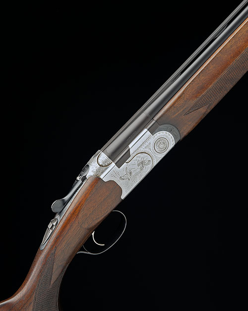 hold-open toplever inlaid with a pigeon, automatic safety with integral barrel selector switch, gold-washed single trigger, border and acanthus scroll engraving surrounding vignettes of hound on point and flushed feather, matt finish, 15in. pistolgrip stock including 1 3/8in. extension, weight 6lb. 4oz. (6lb. 3oz.), in a canvas and leather case with provision for both sets of barrels