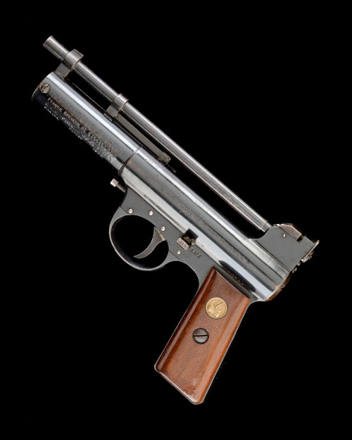 circa 1927, with blued 7 1/8in. barrel, sliding barrel release, blued air-chamber marked with numerous world patents and 'WEBLEY AIR PISTOL MKI MADE IN ENGLAND' on the right hand side and further patents and 'WEBLEY & SCOTT LTD BIRMINGHAM & LONDON' on the left, four-pin trigger housing with trigger adjustment screw and rotating safety catch, smooth walnut grips, the left with inlet Webley 'winged bullet' trademark medallion, inspectors stamp 'J.J.' behind the trigger-guard bow, the whole retaining much original finish with some patchy storage marks to right hand side