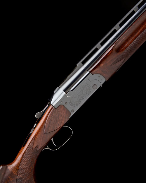 30in. nitro barrels with no mid-rib and 8mm raised ventilated matt top-rib with intermediate bead and high-visibility bead fore-sight, 2 3/4in. chambers, bored approx. full choke in both, hold-open toplever, manual safety toggle with integral barrel selector, blacked action engraved with a hound on point surrounded by a wreath, 1/2in. pistolgrip stock including 1 1/4in. rubber recoil pad, weight 9lb. 5oz.