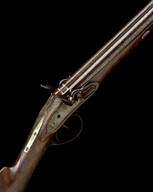 circa 1800, with 25 3/4in. twist iron barrels (muzzles frayed and dented), the top-rib signed in gold 'RIVIERE LONDON', silver fore-sight, starburst engraved to the rib-end at breech, twin platinum lines and touch-holes, fully engraved top-tang with sunken sighting channel, flat curved bevel-edged border engraved lockplates signed 'RIVIERE', stepped pointed tails, rain-proof pans, border engraved frizzens with roller-bearing springs, both hammers and one tumbler missing, possible other internal faults, walnut half-stock chequered at the wrist, (broken through at hand and repaired with a plate), iron furniture, carved pineapple finial and provision for ramrod (missing), lightly distressed throughout