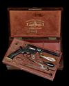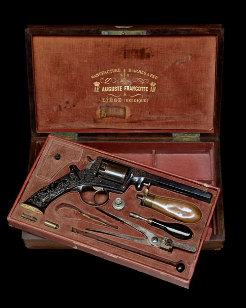 circa 1855, with octagonal 6 1/4in. barrel, scroll engraved band to the muzzle, dove-tailed beaded-blade fore-sight, standing notch rear-sight, the top-strap signed in a ribbon-border 'MANUFACTURED BY A FRANCOTTE LICENCED BY R. ADAMS CO LONDON', fully scroll engraved frame, the decoration extending onto and along the barrel for approximately 2 1/2in., numbered plain cylinder with engraved bands back and front, polished double-action trigger and spurred hammer, ebonised swept saw-grip butt deeply carved with running vines, ivory oak-leaf and acorn carved quartered butt-cap, scroll engraved straps and trigger-guard bow and polished articulated captive loading rod with chequered grip mounted to the left hand side of barrel, the whole being an older re-finish (some loss to detail) TOGETHER WITH its manufacturers original veneered and brass-banded storage and display case compartmented in the continental style and lined in red velvet (faded), the top-lift-out tray containing the revolver together with a bag-shaped flask (dented, spring replaced), a scissors bullet mould, a horn-handled nipple-key, a plated oil-bottle and a cleaning rod with interchangeable tips, provision for a turnscrew (missing), the under-tray with five rectangular compartments, the inner lid with maker and address details in gold lettering (some losses to veneer, some compartments loose)